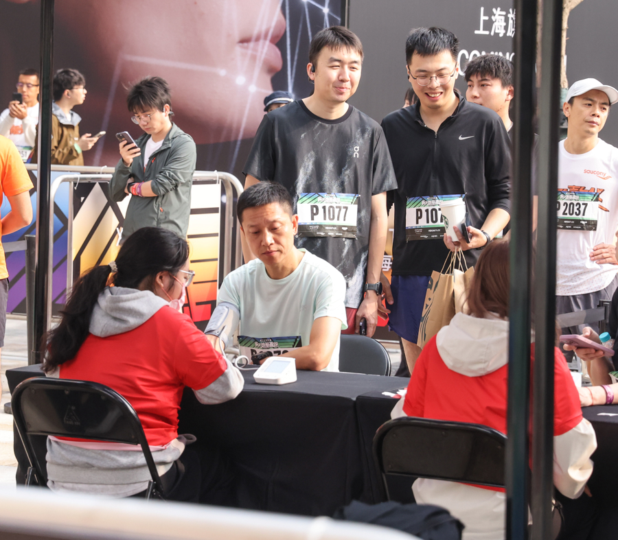 图为参赛运动员正在检录处进行测量血压等身体检查,保证比赛过程中的安全性。